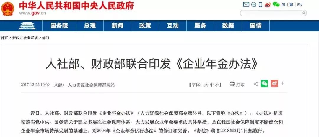 近日,人社部、財(cái)政部聯(lián)合印發(fā)《企業(yè)年金辦法》?!掇k法》將從2018年2月1日起施行。